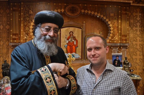 (Seine Heiligkeit, Papst Tawadros II., zusammen mit den Leiter des Projekts Moytamadeia, Dipl.-Geogr. Sebastian Drabinski, im Mäz 2013)